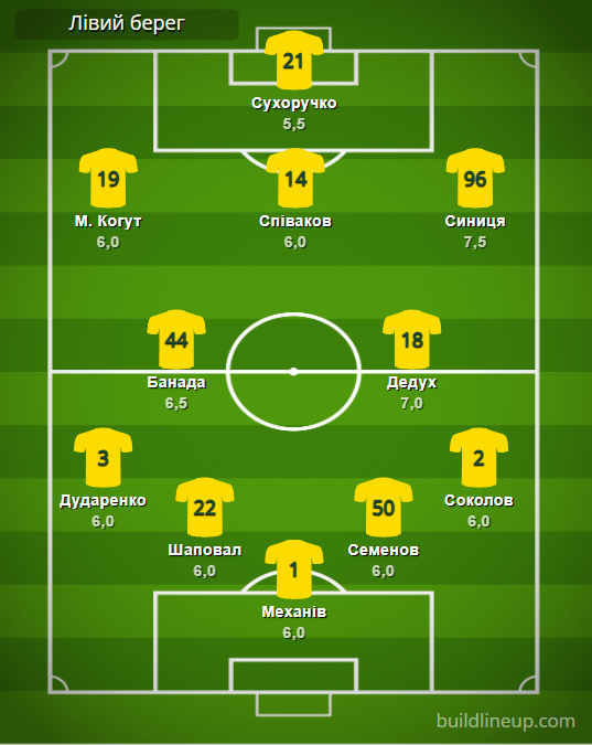 «Левый берег»: Механив – Дударенко, Шаповал, Семенов, Соколов – Банада (Галас, 65), Дедух – Н. Когут (Войцеховский, 65), Спиваков (Приходько, 65), Синица (Косовский, 90) – Сухоручко (Литовченко, 90+3).