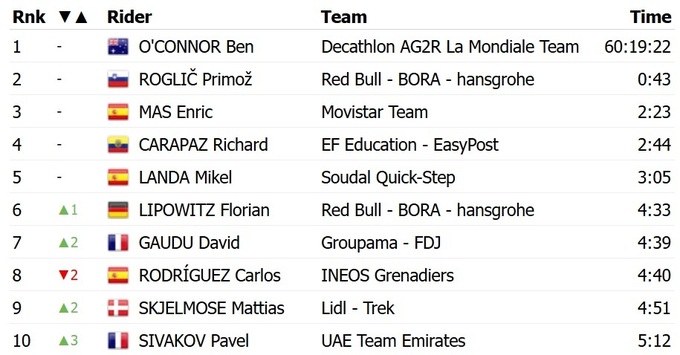 Красную майку лидера общего зачета сохранил австралиец Бен О’Коннор из «Decathlon Ag2r». Сегодня его преимущество над словенцем Приможем Рогличем из «Red Bull Bora» сократилось еще на 38 секунд.