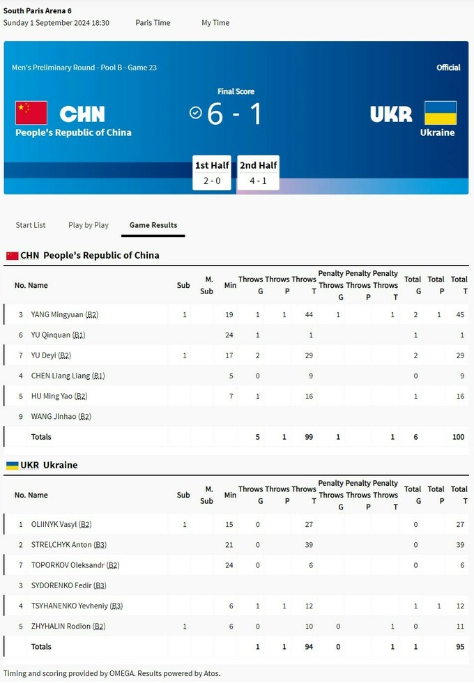 Сборная Украины уступила команде Китая (1:6) в заключительном туре группового этапа в голболе.