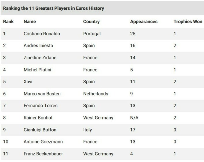 Авторитетный британский портал GiveMeSport обнародовал рейтинг лучших футболистов за всю историю чемпионатов Европы.