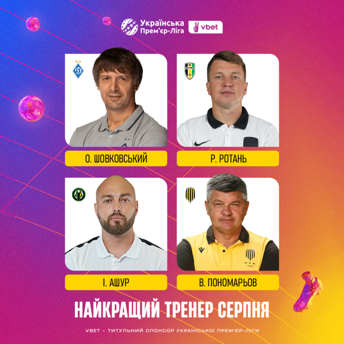 На звание лучшего тренера претендуют Александр Шовковский (Динамо), Руслан Ротань (Александрия), Имад Ашур (Полесье) и Виталий Пономарев (Рух).