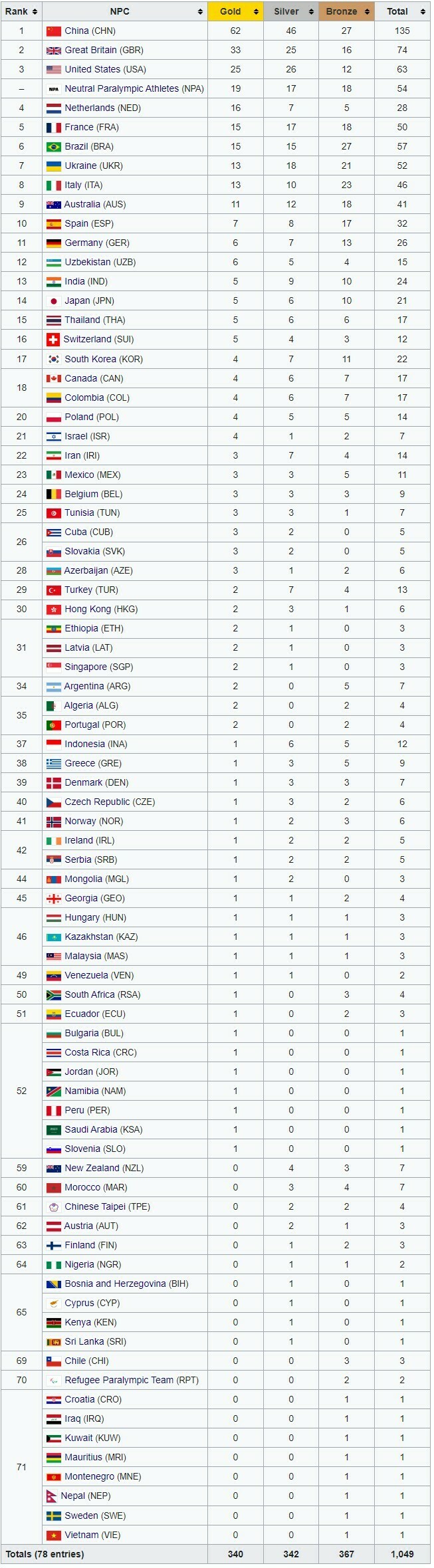 В медальном зачете лидирует Китай (62–46–27), в топ-5 также входят команды: Великобритания, США, Нидерланды, Франция.