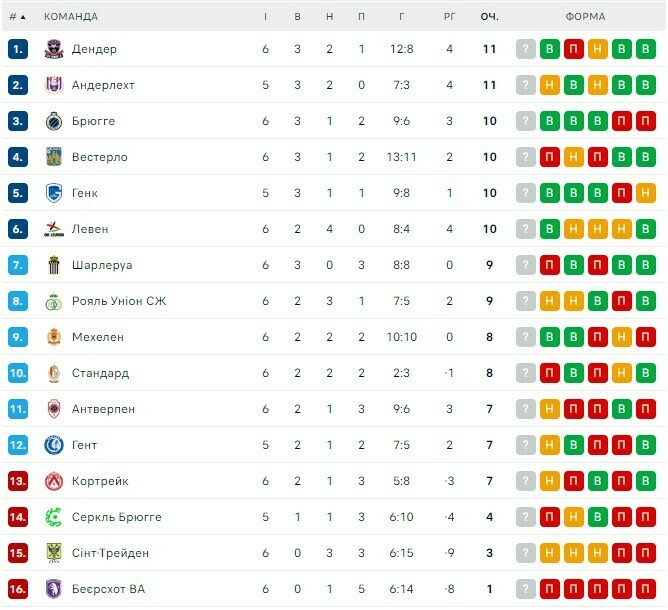 После 6 туров лидируют новичок Дендер и топ-клуб Андерлехт (по 11 очков), в топ-3 также входит Брюгге (10).