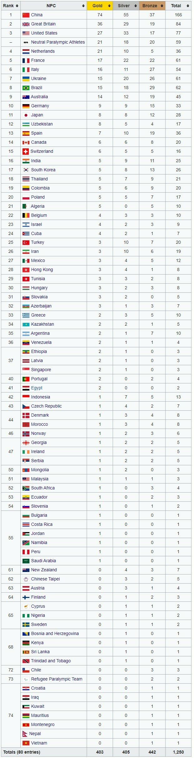 Разыграно 403 из 549 комплектов медалей. 80 стран завоевали хотя бы одну награду, 60 команд имеют в активе минимум одну золотую медаль.