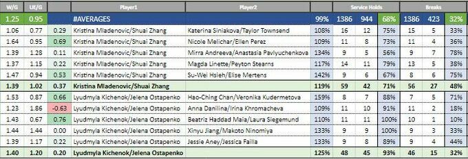В финале Киченок и Остапенко сыграют против дуэта Кристина Младенович (Франция) / Чжан Шуай (Китай). Эта пара выиграла 71% геймов на подаче, у их соперниц в сумме было 40 брейкпоинтов. Но Младенович и Чжан реализовали 48% своих брейкпоинтов (27 из 56). У Людмила и Алены этот показатель составляет 32% (15 из 46).