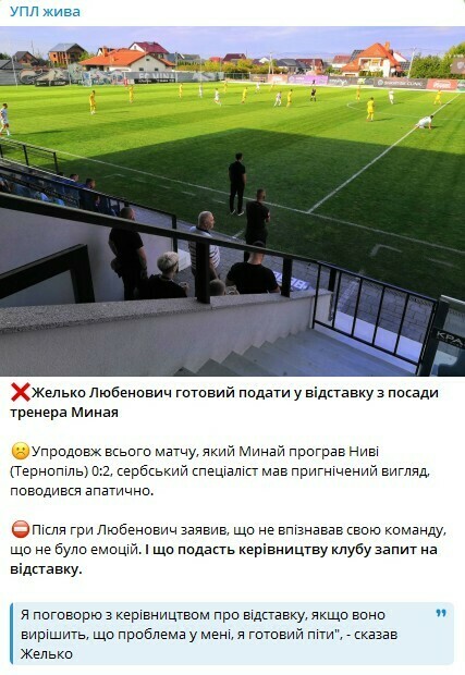 Главный тренер «Миная» Желько Любенович после сегодняшнего поражения 0:2 от тернопольской «Нивы» в матче четвертого тура Первой лиги заявил о том, что готов подать в отставку со своего поста: