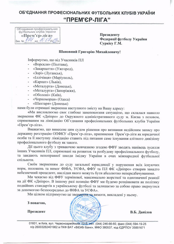 «Ми висловлюємо своє глибоке занепокоєння ситуацією, що склалася навколо звернення ФК «Дніпро» до Окружного адміністративного суду м. Києва з позовом, спрямованим на ліквідацію Об’єднання професіональних футбольних клубів України «Прем’єр-ліга».