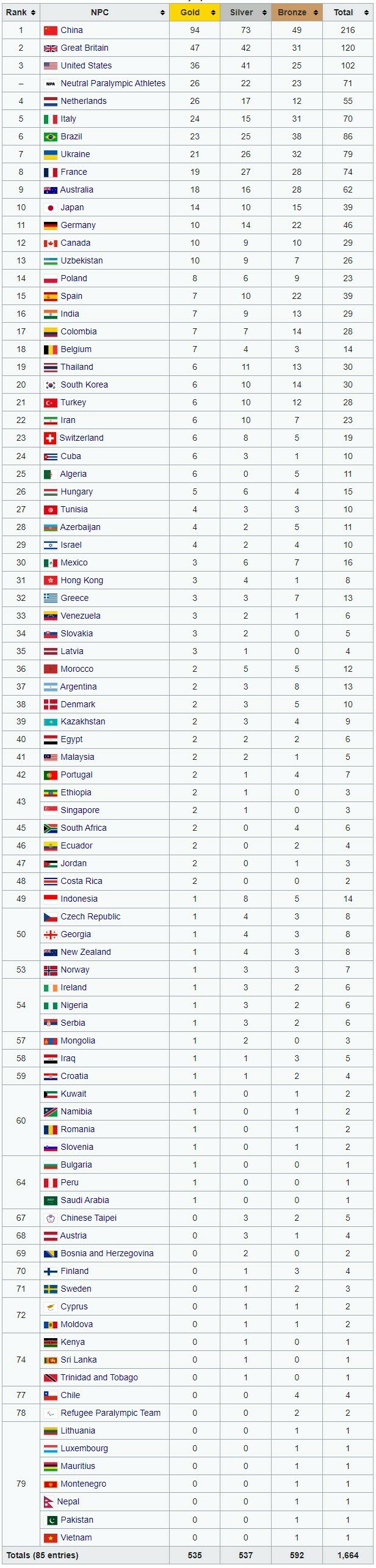 В медальном зачете лидирует Китай (94–73–49), в топ-5 также входят команды: Великобритания, США, Нидерланды, Италия.