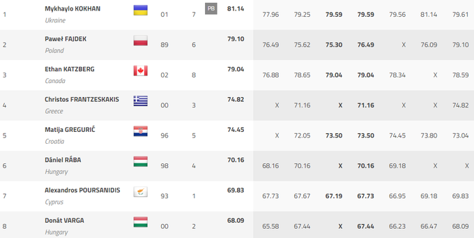 Кохан метнул молот на 81,14 метра, установив личный рекорд. Украинец улучшил свой лучший результат на 38 сантиметров.