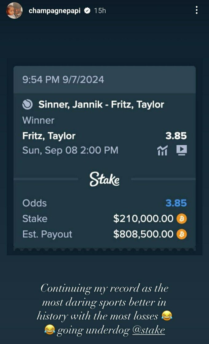 Это признал и сам Дрейк, опубликовал скриншот ставки на Фритца в своих социальных сетях: