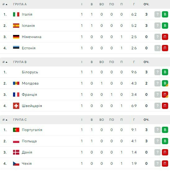 - Группа В: Испания, Польша, Англия, Швейцария.