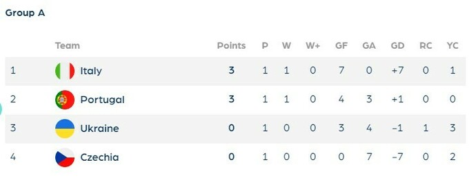 - Группа А: Португалия, Украина, Италия, Чехия.