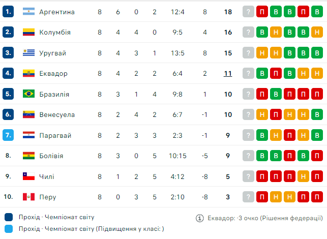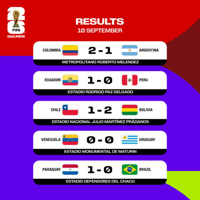 В ночь на 11 сентября состоялись матчи 8-го тура квалификации чемпионата мира 2026 в зоне Южной Америки.