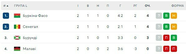 После двух туров в квартете сборная Буркина-Фасо набрала 4 очка и делит первое место с Сенегалом.