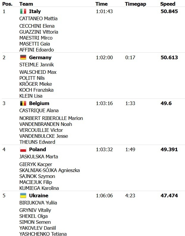 Победу одержала сборная Италии в составе Маттиа Каттанео, Мирко Маэстри, Эдоардо Аффини, Элена Чеккини, Виттория Гуаццини, Гайя Мазетти. «Скуадра адзурра» опередила команды Германии и Бельгии.