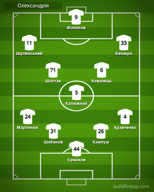 «Александрия»: Ермаков – Мартынюк, Шабанов, Кампуш, Кравченко – Шостак (Джевани, 46), Калюжный, Ковалец (Погорелый, 62) – Шулянский (Мишнев, 46), Филиппов (Козак, 62), Беззера (Беляев, 89).