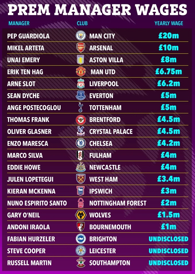 В топ-4 также входят Унаи Эмери из «Астон Виллы» с зарплатой в размере 8 млн фунтов и Эрик тен Хаг из «Манчестер Юнайтед», которому клуб платит за год 6,75 млн фунтов.