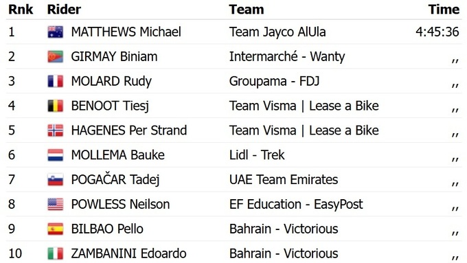 В финишном спринте из пелотона Мэттьюз опередил эритрейца Биньяма Гирмая из «Intermarche Wanty» и француза Руди Молара из «Groupama FDJ».