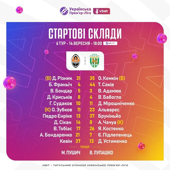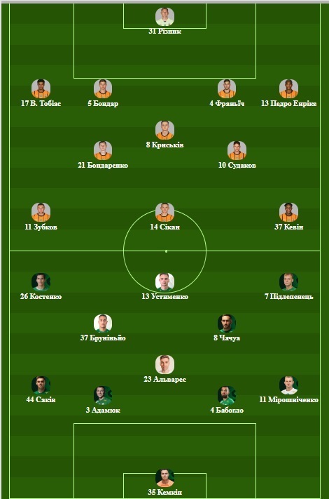 «Шахтер»: Резник, Педро Энрике, Франьич, Бондарь, Винисиус Тобиас, Крыськив, Бондаренко, Судаков, Кевин, Зубков, Сикан