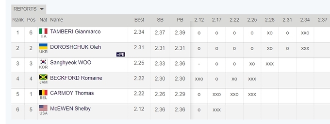 Олег с первой попытки взял 2.12 м, 2.17 м, 2.22 м и 2.25 м. Высоту 2.28 м Дорощук взял со второй попытки, а затем с первой попытки повторил личный рекорд 2.31 м. С точно такими же показателями шел и Тамбери.