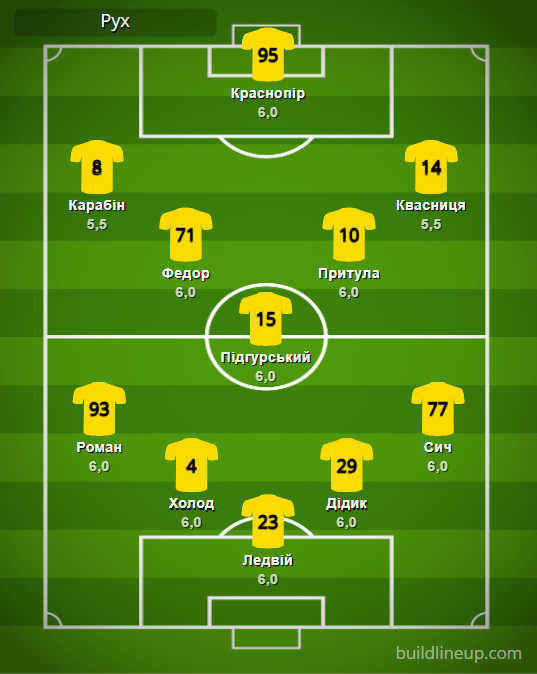 «Рух»: Ледвий – Роман (Лях, 87), Холод, Дидык, Сыч – Федор, Пидгурский (Рунич, 64), Притула – Карабин, Краснопир, Квасница (Клайвер, 56).