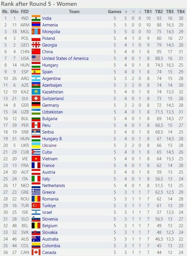 Женская украинская команда набрала 8 очков из 10 и занимает 20-ю позицию. Лидируют: Индия, Армения и Монголия (по 10 очков из 10).