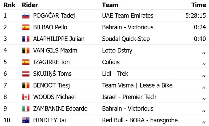 Он на 24 секунды опередил испанца Пельо Бильбао из «Bahrain Victorious», который финишировал вторым. Топ-3 замкнул француз Жулиан Алафилипп из «Soudal Quick Step», который проиграл 40 секунд.