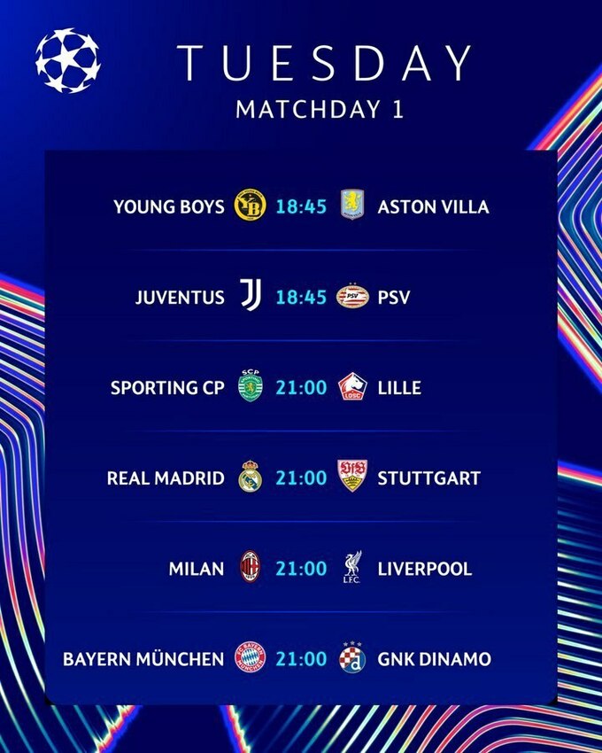 Согласно календарю, старт групповой стадии дадут поединки в Турине и Берне, где встретятся, соответственно, «Ювентус» и ПСВ, а тажке «Янг Бойз» и «Астон Вилла». Матчи начнутся в 19:45 по киевскому времени.