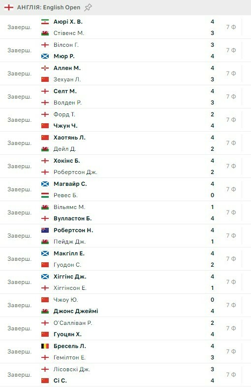 Продолжает борьбу и 4-кратный чемпион мира Марк Селби из Англи, обыгравший Аарона Хилла из Ирландии (4:2).