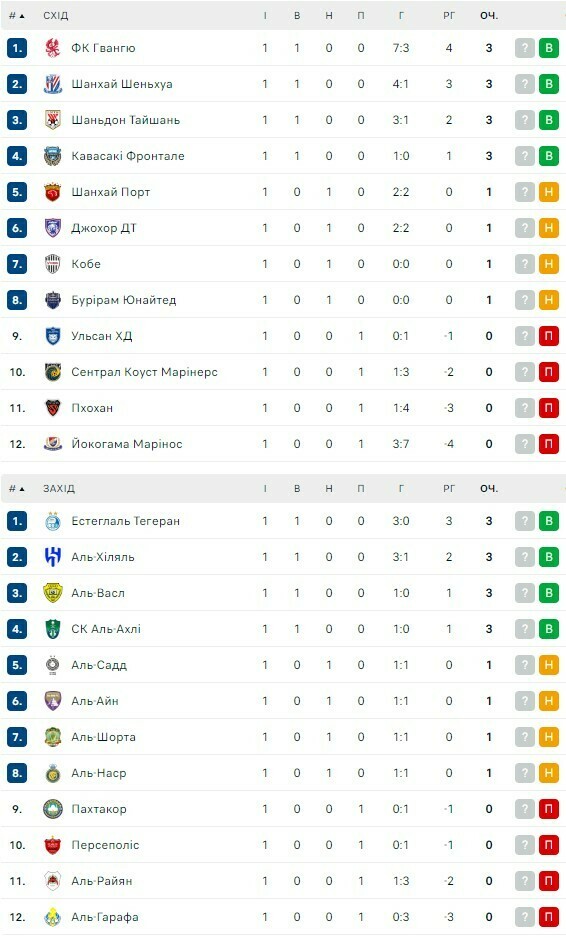Азиатская Лига чемпионов. Турнирная таблица после первого тура