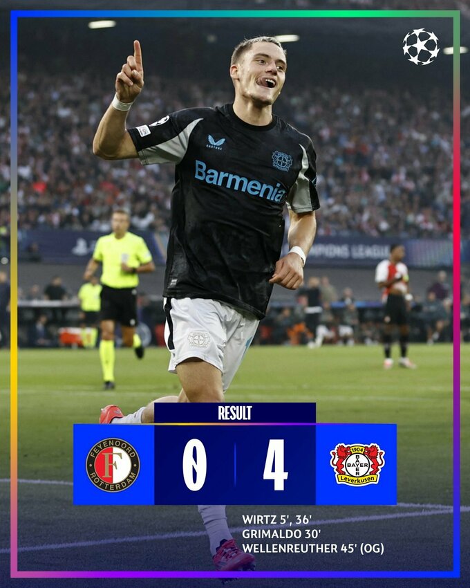 Немецкий Байер в гостях отгрузил 4 мяча нидерландскому Феейенорду. Все голы были забиты в первом тайме.