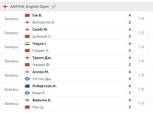 4-кратный чемпион мира Марк Селби из Англии также продолжает выступление на турнире после победы над Си Цзяхуэй из Китая (4:3). В 1/4 финала его его соперником будет Ишприт Чадха, малоизвестный снукерист из Индии.