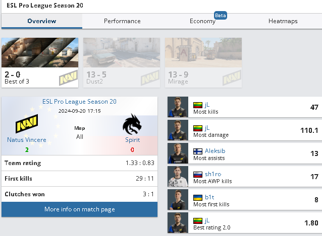 NAVI доминировали по всем показателям: команда показала общий рейтинг 1.33 против 0.83 у Spirit, сделала 29 первых убийств, а также выиграла три клатча против соперников. Наибольший вклад в победу внес игрок NAVI jL, который стал лидером по количеству убийств (47) и нанесенного урона (110.1).