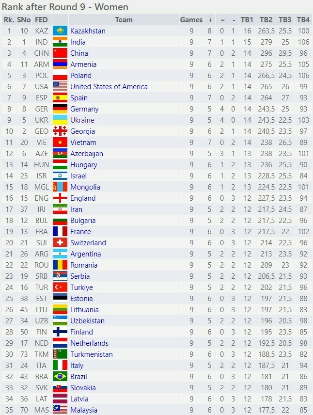 Женская украинская команда набрала 14 очков из 18 и занимает 9-е место. Лидирует Казахстан (16 из 18), опережая Индию (15).