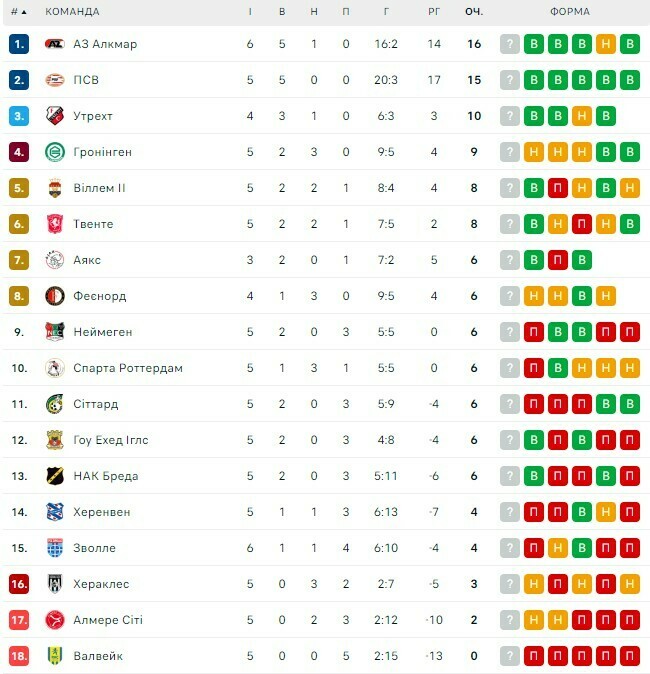 АЗ Алкмар набрал 16 очков и вышел в лидеры, опередив ПСВ (15).