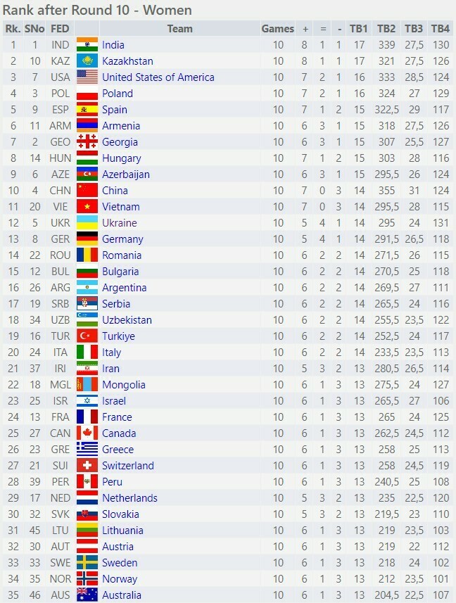Женская украинская команда набрала 14 очков из 20 и занимает 12-е место. Лидируют Индия и Казахстан (по 17 из 20), далее идут США и Польша (по 16).