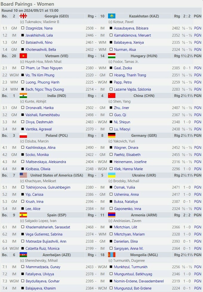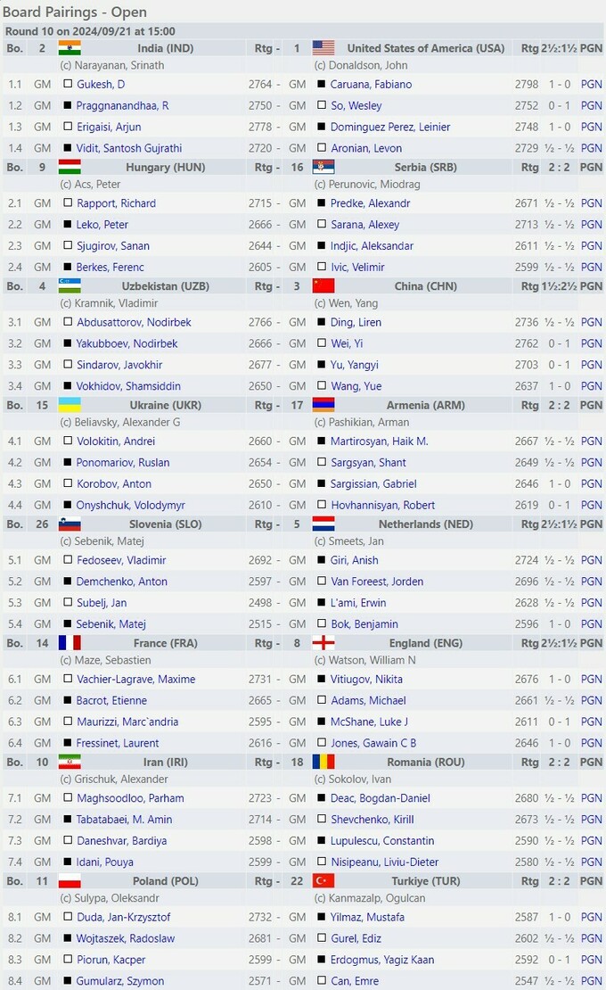21 сентября в венгерском Будапеште состоялись матчи предпоследнего, 10-го тура шахматной Олимпиады 2024.