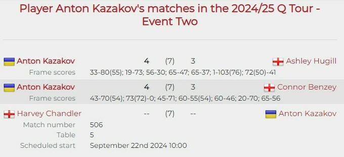 Другой украинец Антон Казаков на старте турнира в 1/32 финала с трудом победил Эшли Хьюгилла из Англии (4:3), а затем снова в решающем фрейме обыграл англичанина Коннора Бензи (4:3).