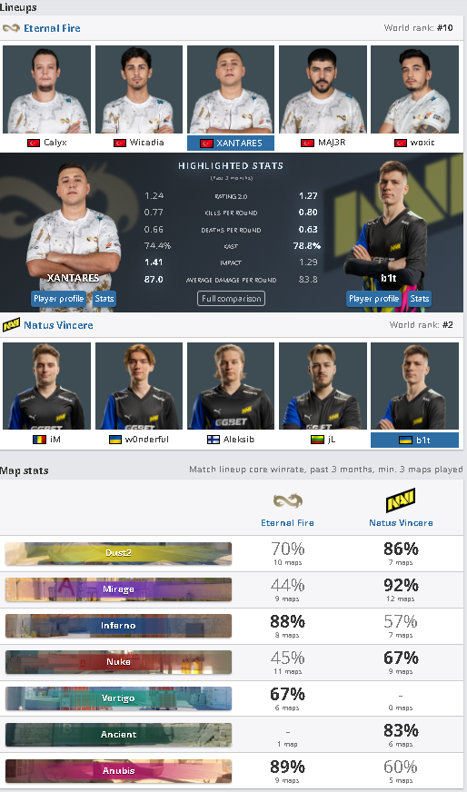 В составе Eternal Fire лидирует Исмаилкан «XANTARES» Дёрткадеш, который показывает впечатляющую статистику: среднее количество убийств за раунд составляет 0.77, а средний урон — 87.0. Ему противостоит Валерий «b1t» Ваховский из NAVI, который имеет 0.72 убийства за раунд и средний урон — 83.8.