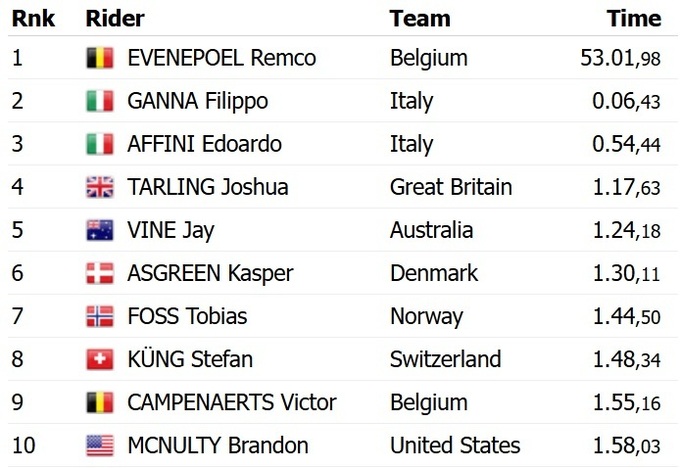 Бельгийский велогонщик Ремко Эвенпул стал чемпионом мира 2024 года в индивидуальной гонке с раздельным стартом. Он на 6 секунд опередил итальянца Филиппо Ганну, топ-3 замкнул еще один представитель Италии, свежеиспеченный чемпион Европы Эдоардо Аффини.