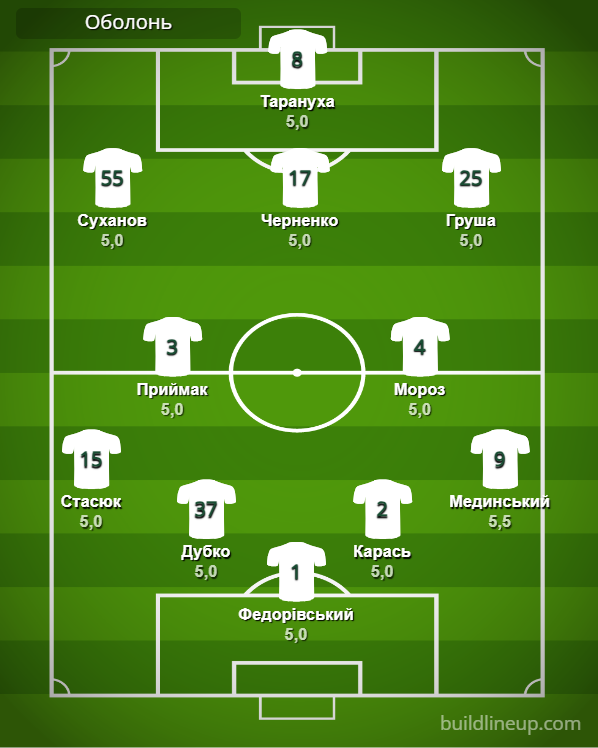 «Оболонь»: Федоровский – Стасюк, Дубко, Карась, Мединский – Приймак, Мороз (Слободян, 75) – Суханов (Близниченко, 83), Черненко (Курко, 75), Груша (Витенчук, 62) – Тарануха (Теслюк, 62).
