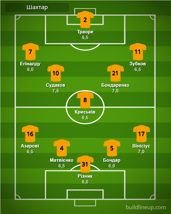 «Шахтер»: Резник – Азаров, Матвиенко, Бондарь, Винисиус (Грам, 79) – Судаков (Глущенко, 85), Крыськив (Степаненко, 71), Бондаренко – Эгиналду (Невертон, 71), Траоре, Зубков (Педриньо да Силва, 71).