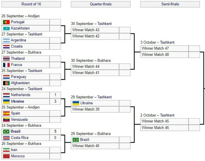 В 1/4 финала сборная Украины 29 сентября в Ташкенте сыграет против победителя пары Испания – Венесуэла.