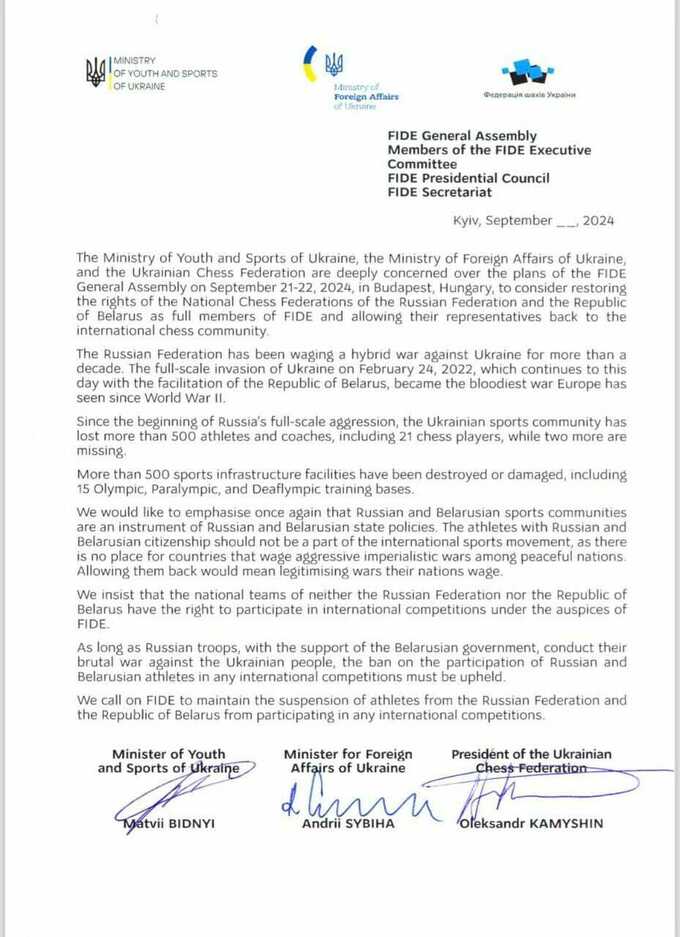 Міністерство молоді та спорту України, Міністерство закордонних справ України та Федерація шахів України глибоко стурбовані планами Генеральної Асамблеї ФІДЕ 2–22 вересня 2024 року в Будапешті, Угорщина, розглянути можливість відновлення права національної шахової федерації російської федерації та республіки білорусь як повних членів ФІДЕ, що дозволить їх представникам повернутися до міжнародної шахової спільноти.