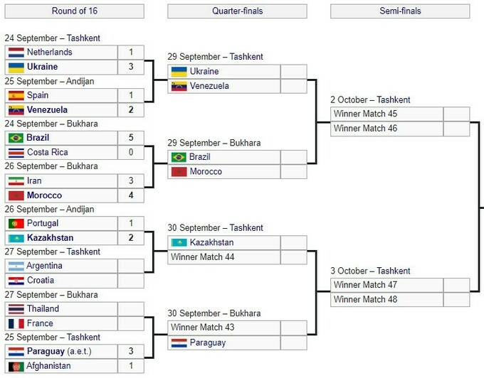 В 1/4 финала 29 сентября в Ташкенте сыграют сборные Украины и Венесуэлы. Также определена пара: Бразилия – Марокко (29 сентября в Бухаре).