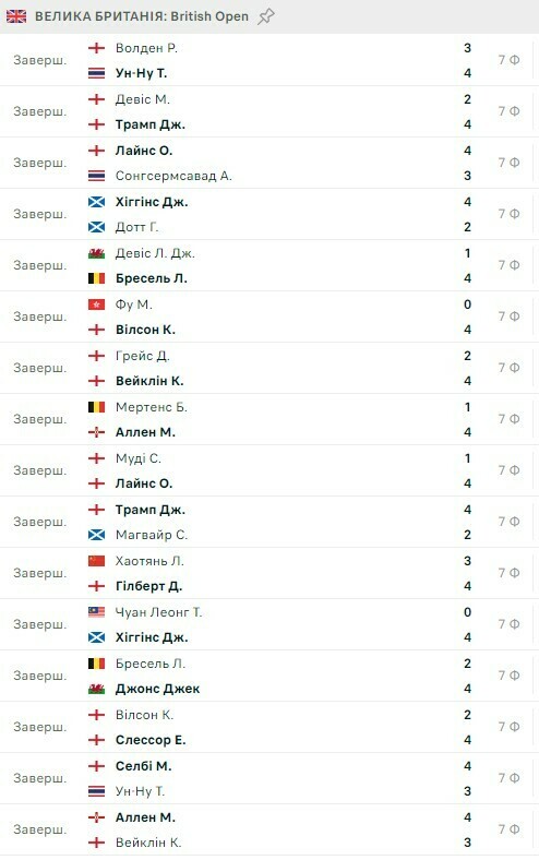 А вот чемпионы мира двух последних лет – бельгиец Люка Бресель (победитель ЧМ-2023), и англичанин Кайрен Уилсон (ЧМ-2024) – выбыли из турнира на стадии 1/8 финала. Бресель уступил Джеку Джонсу из Уэльсу (2:4), а Уилсон не справился с Эллиоттом Слессором (2:4).