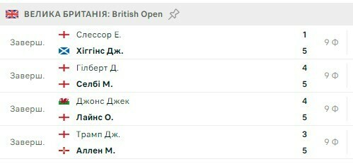 - Элиотт Слессор (Англия) – Джон Хиггинс (Шотландия) – 1:5