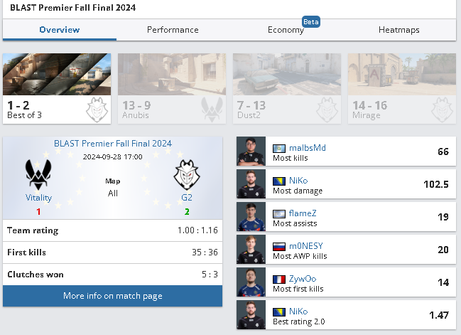 - NiKo из G2 продемонстрировал блестящую игру, нанеся наибольшее количество урона (102.5) и получив лучший рейтинг 2.0 — 1.47.