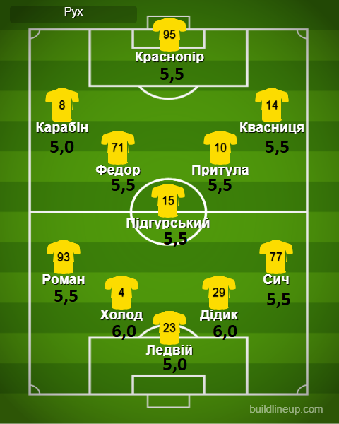 «Рух»: Ледвий – Сыч, Дидык, Холод, Роман – Пидгурский, Притула (Рунич, 81) – Квасница (Клайвер, 70), Федор, Карабин (Климчук, 60) – Краснопир