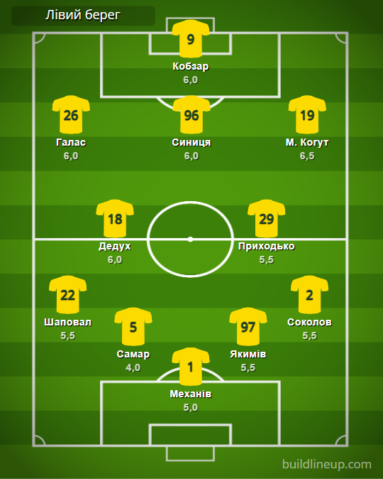 «Левый берег»: Механив – Шаповал, Самар, Якимов, Соколов – Дедух, Приходько – Галас (Войцеховский, 77), Синица, М. Когут (И. Когут, 76) – Кобзарь (Семенов, 84).